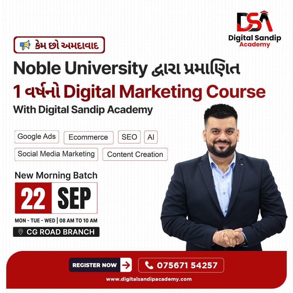 - With Digital Sandip Academy’s Masters in Digital Marketing course in Ahmedabad, you can easily enhance your digital marketing skills and make your successful career in Digital Marketing.